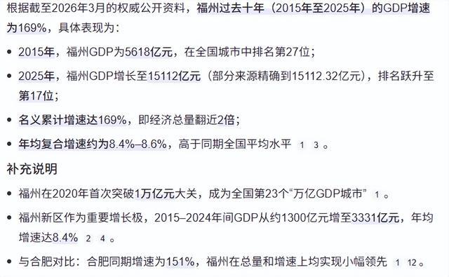 十年间,福州GDP从5618亿元增至15112亿元,名义增速169%,稳居全国省会第一,从全国第29位跃升至第17位,实现了跨越式逆袭。